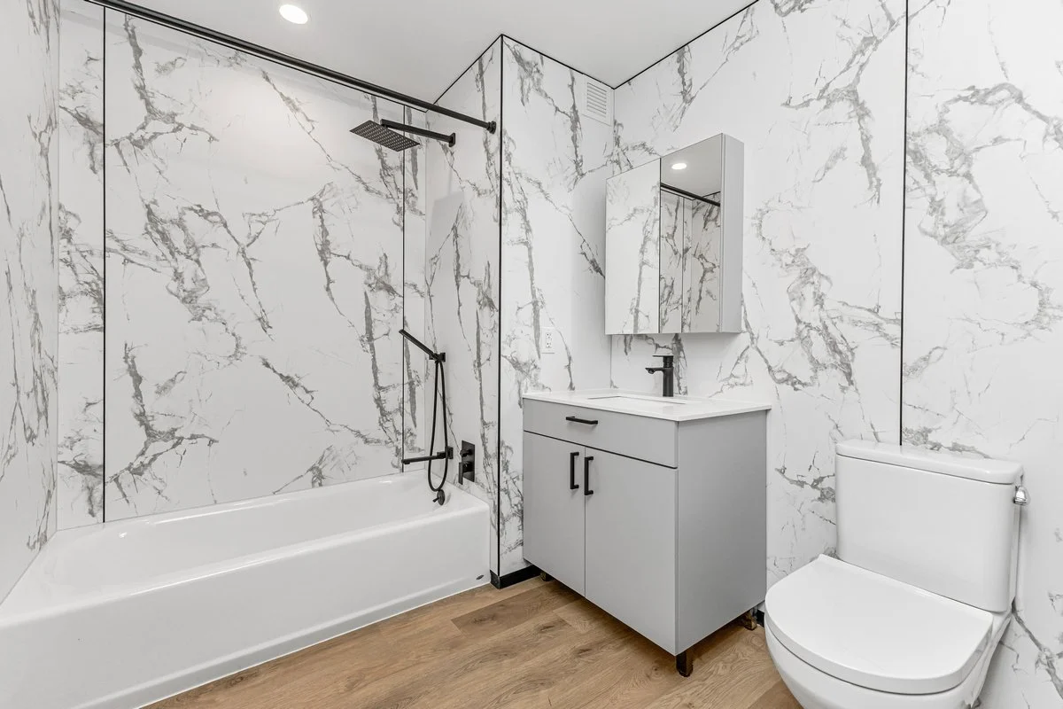 Decompress and immerse yourself in the opulence of fully-tiled bathrooms, featuring a matte grey vanity with a quartz countertop, creating a spa-like oasis within your home.